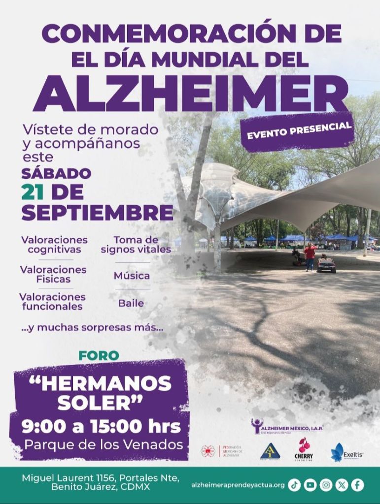 El sábado 21 de septiembre, Día Mundial del Alzheimer, se realizará un evento presencial en el Foro “Hermanos Soler” del Parque de los Venados, durante el cual los asistentes podrán participar en valoraciones cognitivas, físicas y funcionales, además de disfrutar de actividades recreativas como música y baile.