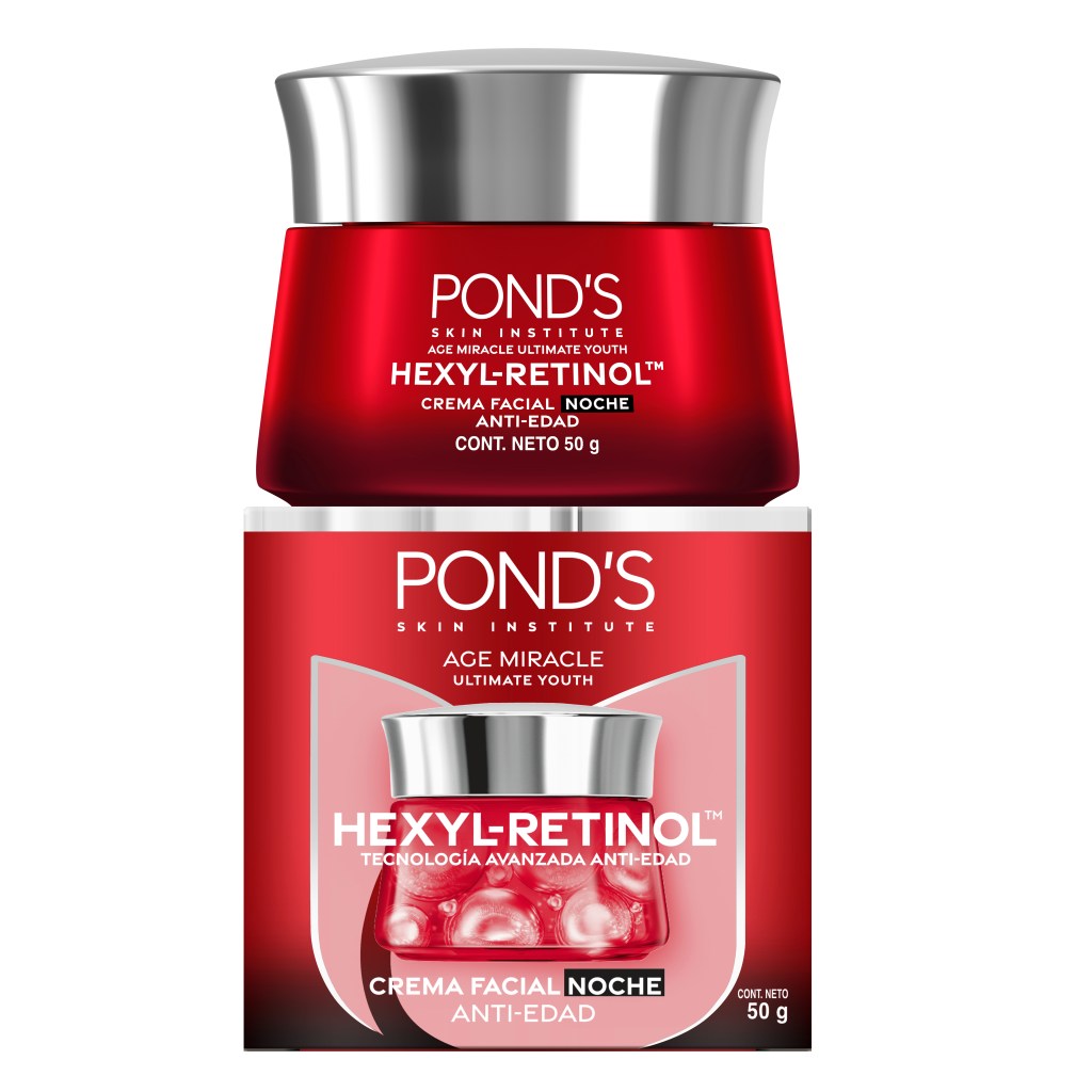 Para combatir los signos visibles del envejecimiento, ingredientes como el Retinol y la Niacinamida son indispensables. Pond’s te ofrece una opción integral en su línea Age Miracle Ultimate Youth, cuya fórmula con HEXYL-RETINOL™ (tecnología exclusiva del POND’S Skin Institute), te ofrece múltiples beneficios anti-edad gracias a la combinación de ingredientes activos de alta potencia, como Hexylresorcinol que favorece la reducción de manchas causadas por el sol, además contiene Retinol-c que estimula la producción de colágeno para disminuir las líneas de expresión, y niacinamida que ayuda a dar luminosidad a la piel.2