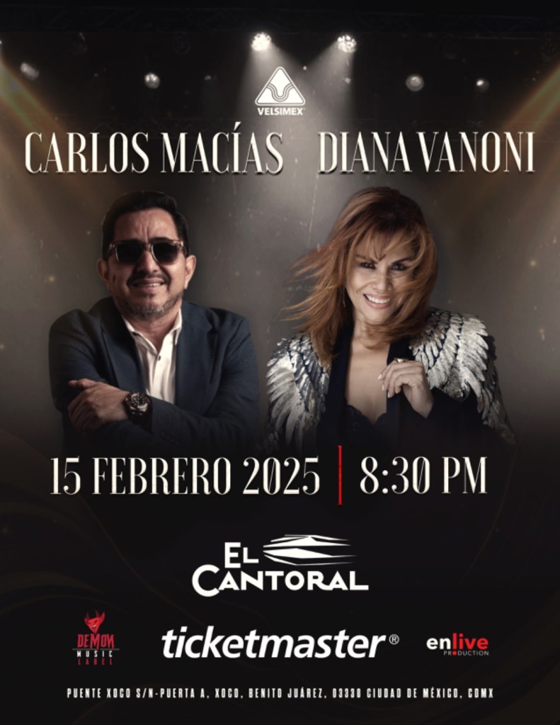 Diana Vanoni y Carlos Macías se presentan este sábado 15 de febrero de 2025 en el Cantoral, ubicado en Puente Xoco s/n-Puerta A, Xoco, Benito Juárez, 03330 Ciudad de México, CDMX, Metro Coyoacán. Boletos a la venta en el Sistema Ticketmaster y en taquillas del inmueble