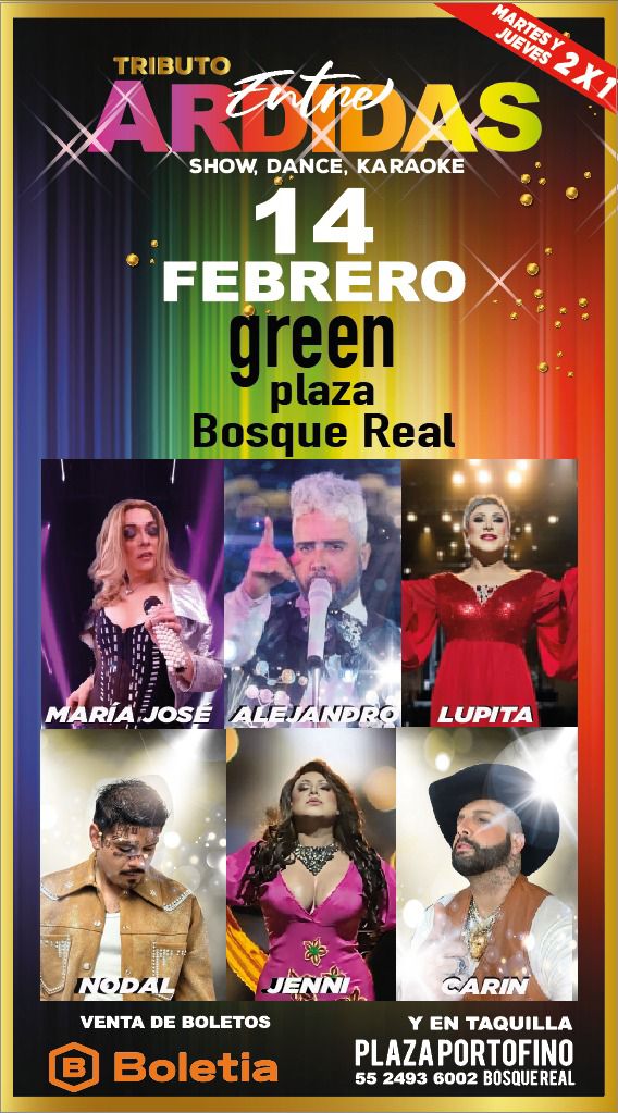 No te pierdas este show que te transportará a un concierto donde tendrás un gran abanico de estrellas en un solo escenario. Viernes 14 de febrero a las 21:00 horas en Green Plaza Bosque Real ubicado en Blvd. Loma Real 1-Mz. I, Lt. 1, Conjunto Urbano, Bosque Real, 52774 Ciudad de México, Méx.