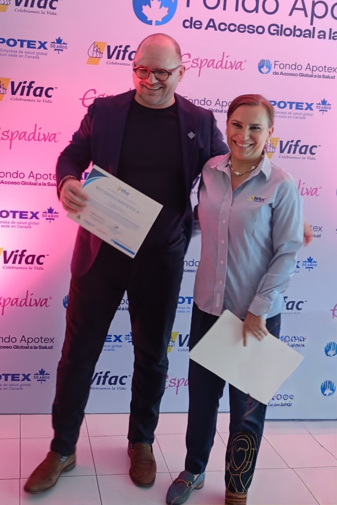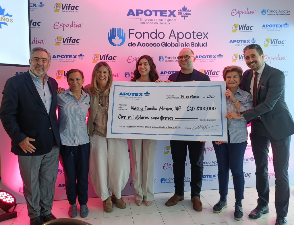 Este miércoles 26 de marzo, Marilú Mariscal de Vilchis, Gabriela Vilchis, Romina González, la Licenciada María del Carmen Caruz, Víctor Villalobos y Isabel Rodríguez, representantes de Vida y Familia México, I.A.P. (VIFAC), se reunieron para recibir de manos de André Soresini, Vicepresidente de Apotex para Latinoamérica, el donativo de $100,000 dólares canadienses, que año con año y durante los próximos tres años Apotex otorgará a Vida y Familia México, para fortalecer los servicios de salud materna, erradicar la pobreza, el hambre, la desigualdad, salud y bienestar para las agremiadas en esta institución, en presencia de autoridades del Gobierno del Estado de México y líderes comunitarios. VIFAC es el tercer beneficiario del Fondo de Acceso Global a la Salud de Apotex y el primero en México.