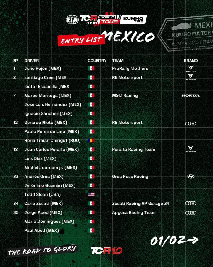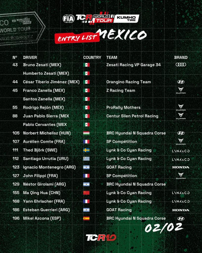 El listado oficial ya fue publicado: 24 autos del serial mundial estarán en la pista, junto a 25 pilotos del TCR México, que darán su máximo esfuerzo para poner en alto el nombre de nuestro país. México tendrá presencia en cada curva, en cada aceleración y, sin duda, en la lucha por los muy codiciados primeros lugares.