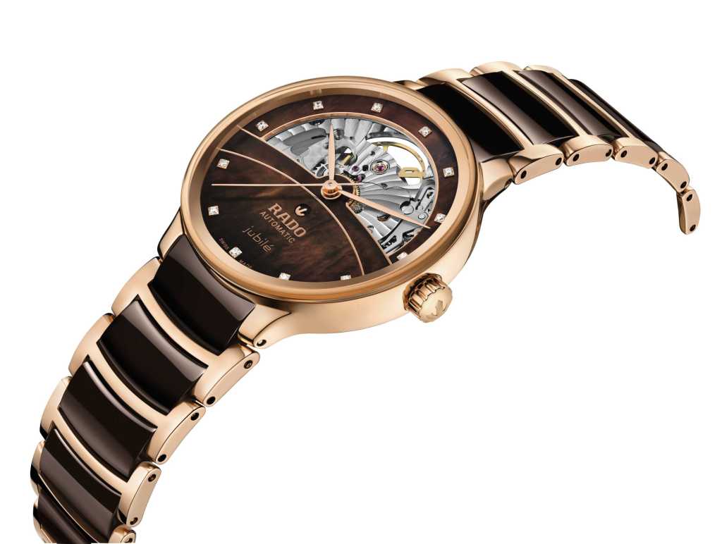 El tono del fondo de la esfera combina con el de los eslabones centrales del brazalete, elaborados en cerámica de alta tecnología de Rado, mientras que la caja y las hileras exteriores de eslabones del brazalete se unen en alegre armonía, llenando de calidez los corazones de los amantes con los reconfortantes tonos del acero inoxidable con revestimiento PVD de color oro rosa. El cristal de zafiro suavemente convexo y con el borde redondeado, unido a la caja, completa el diseño y ofrece una legibilidad perfecta gracias al revestimiento antirreflejo de ambas caras. Los elegantes elementos metalizados elegidos para el logotipo de la marca y la información del modelo, de un color oro rosa a juego, se aplican directamente en la cara interior del cristal. La tapa trasera de acero inoxidable incorpora un segundo cristal de zafiro, lo que permite contemplar una vista detallada del mecanismo de este modelo Open Heart, que es la última incorporación a la familia de relojes del concepto “Art of Skeletonization” de Rado.