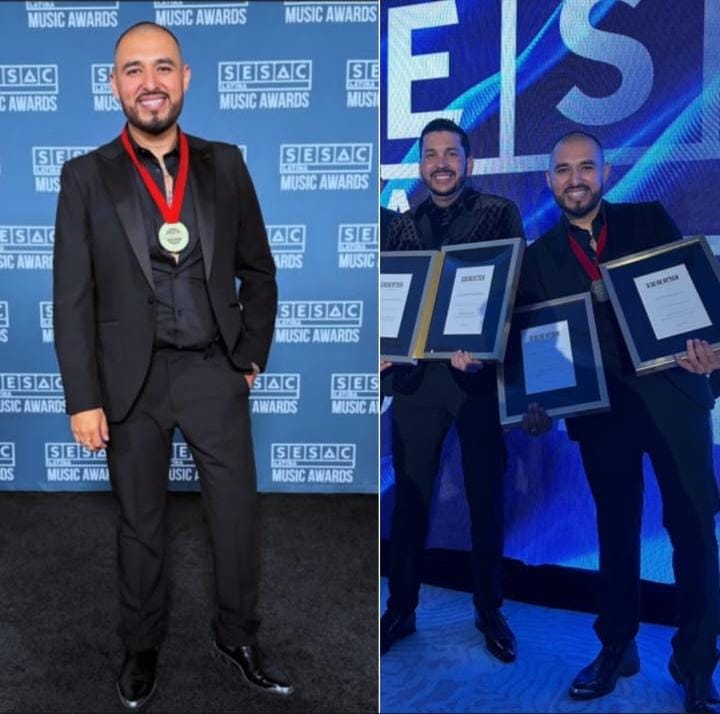 En la ciudad de Los Ángeles, California, otorga felicitaciones a Meño Segovia y Luis Ángel «El Flaco» por su merecido premio por estar cuatro semanas consecutivas en Playlist de SESAC LATINA con el tema «Amor Bonito».