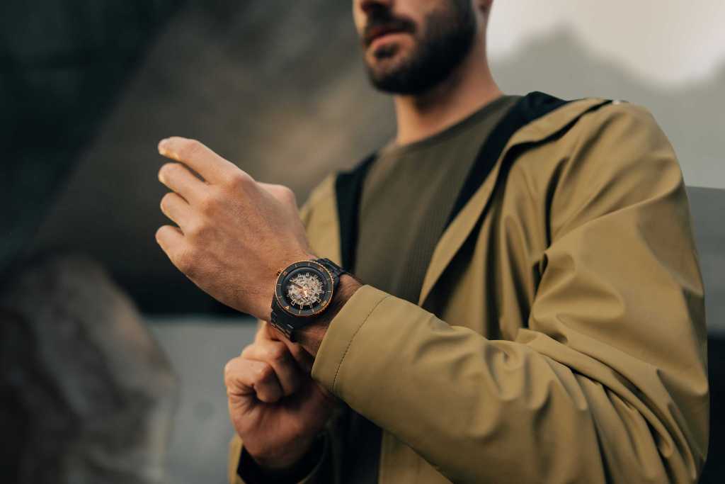 El fiable mecanismo automático calibre R808 con 25 piedras preciosas, sometido a ensayos en cinco posiciones y equipado con una espiral antimagnética de Nivachron™, proporciona una precisión excepcional y unas impresionantes 80 horas de reserva de marcha. Gracias a un segundo cristal de zafiro en la tapa trasera de titanio con revestimiento PVD de color negro, el mecanismo y sus componentes, así como las complejas capas y detalles, se pueden observar en funcionamiento desde el anverso y el reverso del reloj.
