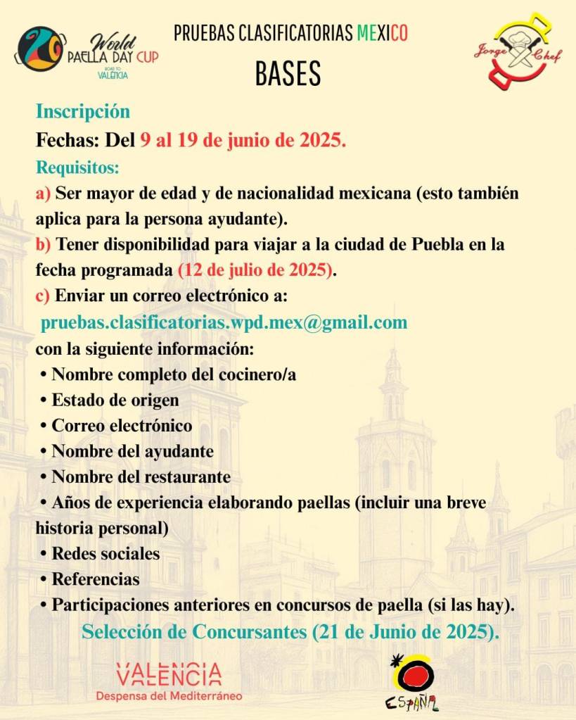 La ciudad de Puebla, México, será sede de un evento culinario de alto nivel: las Pruebas Clasificatorias del World Paella Day México, donde se elegirá al chef que representará con orgullo a nuestro país en la World Paella Day Cup 2025, a celebrarse el próximo 20 de septiembre en Valencia, España, capital mundial de la paella.