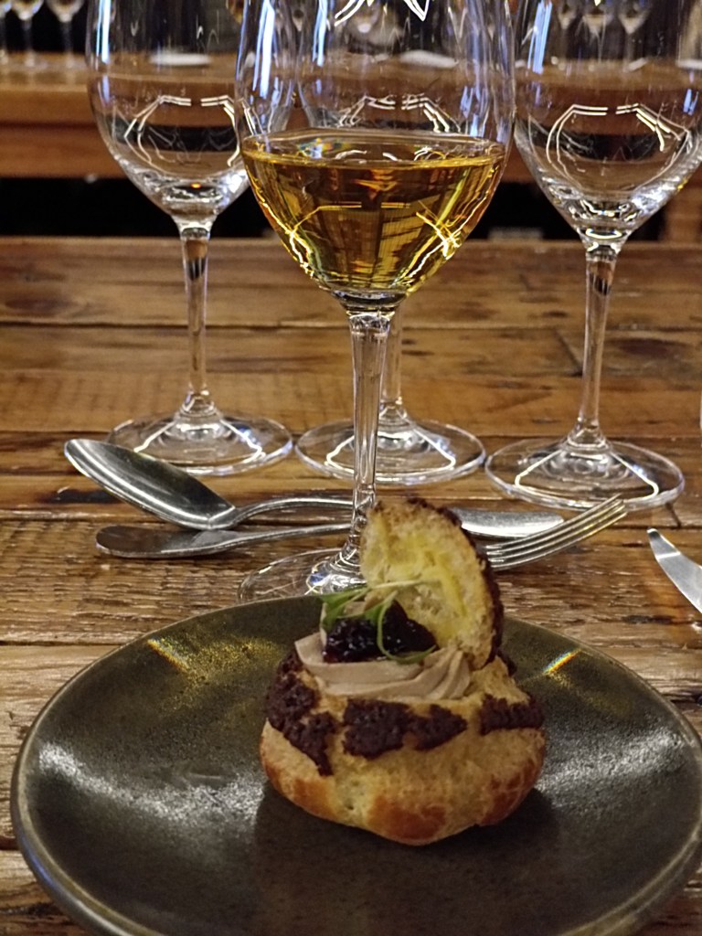 La cata se inició con un vino (Berthoumieu Pacherenc du Vic-Bilh) ligeramente dulce de vendimia tardía, con un Foie Qras de Pato para su maridaje, comparando este vino con el gran mosquetero Athos, por ser un vino con grandes secretos y misterioso al degustar este, igual que Athos que guardaba tantos secretos en su vida privada.