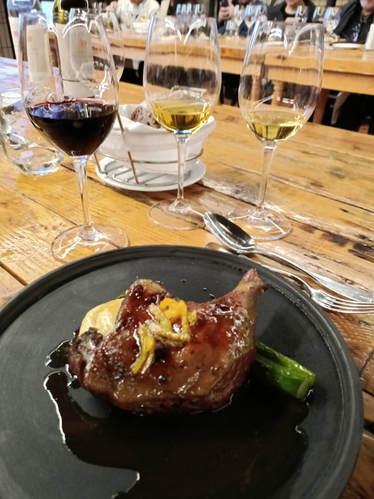 Como plato fuerte se brindó un Pato Confitado y Salsa de Yuzu con guarnición de pure de papa y espárragos, acompañado de un vino del suroeste de Francia (Berthoumier Madiran, Tannat y Cabernet Sauvignon), esta bebida cuenta con sabores muy fuertes, maduran más lentos, con mayor acides, haciéndolo un vino más completo en su degustación y más longevo. D’Artagnan uno de los mosqueteros más intrépidos, y con gran audacia para llegar a obtener grandes cargos en el régimen militar, por ello se identifica muy bien con este vino, fuerte, con aromas permanentes.