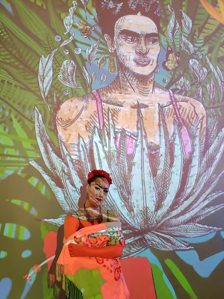 Espacio Alter e Ideal, se conjugan para presentar el recorrido inmersivo de la vida y obra de Frida Kahlo, en una travesía sensorial y emocional adentrándose al alma de la Kahlo, en un espacio de 2,000 m2, con proyecciones de 360°, con realidad virtual, video mapping, archivos inéditos y música original, se relata la biografía de esta artista.
