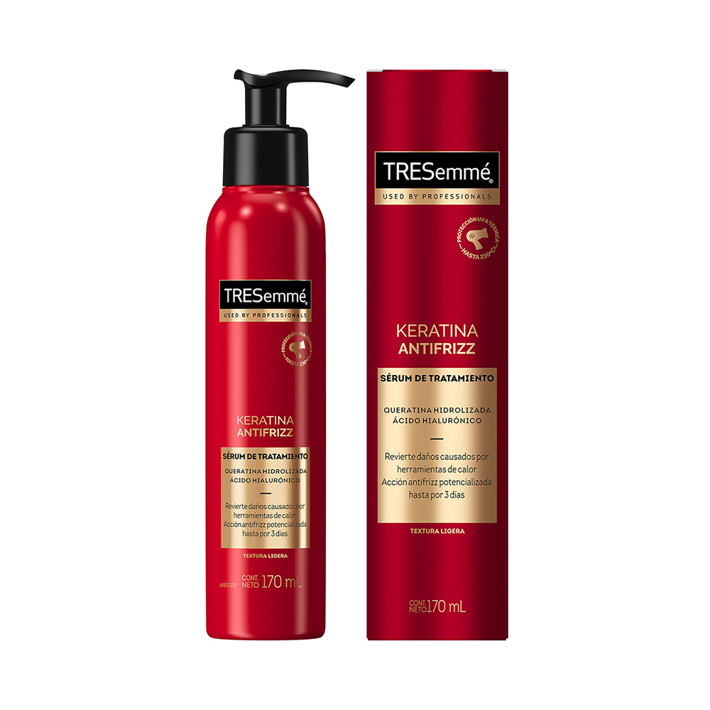 - Protección térmica: antes de usar cualquier tipo de herramienta de calor, protege tu cabello con el Serum Tratamiento Keratina Antifrizz de TRESemmé, que lo protege hasta 230ºC, mientras que hidrata y suaviza el cabello.