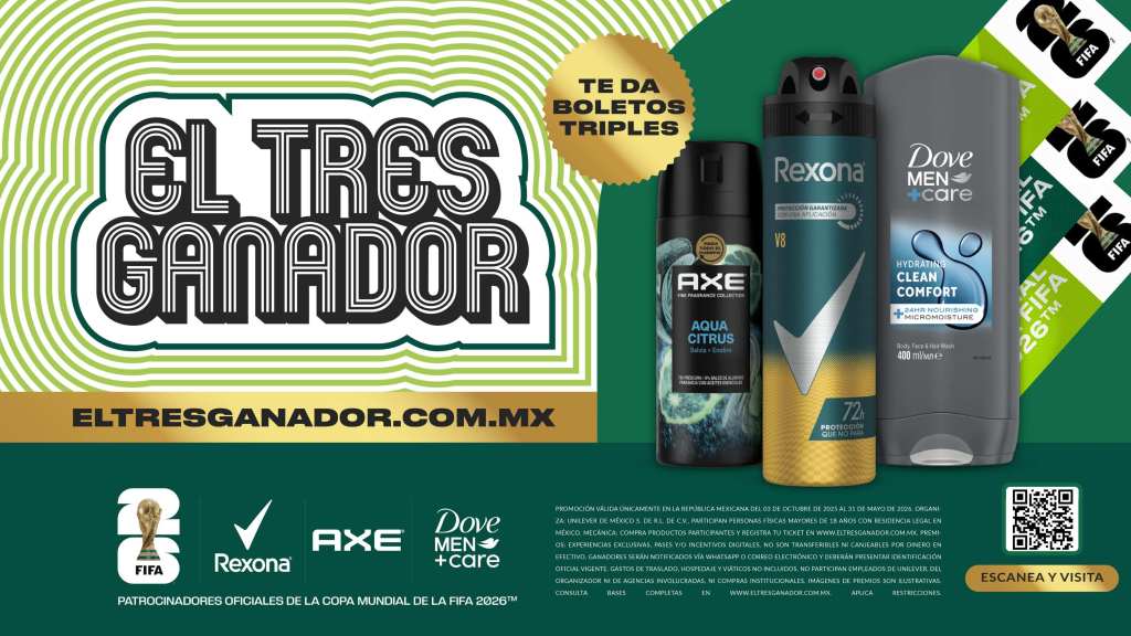 El futbol no se vive, se siente. Y cuando México vuelve a ser anfitrión de la Copa Mundial de la FIFA™ por tercera ocasión, la pasión se triplica. Con ese espíritu, Rexona, Axe y Dove —tres marcas icónicas de Unilever— presentan “El Tres Ganador”, una promoción inédita que regalará 184 pases triples para asistir a los partidos (en México) del torneo más esperado del planeta, además de más de 3,000 premios adicionales.