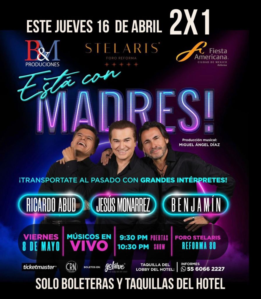 Este 08 de mayo el Foro Stelaris ubicado en Reforma #80 en el piso 25 del Fiesta Americana, abre sus puertas para brindar un show digno de todas las Mamás. ¡¡ESTA CON MADRES!! adquiere tus boletos en taquilla del establecimiento, Boletos $950 y $750 ¡Juntos en un show lleno de romance, ritmo y nostalgia que no te puedes perder!