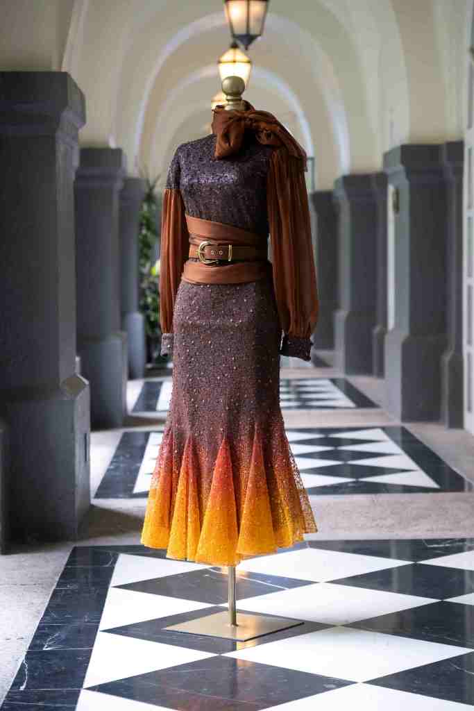 La materialidad juega un papel protagónico. Relieves, aplicaciones, pedrería y textiles con volumen crean superficies que evocan sensaciones táctiles, mientras que la paleta cromática —dominada por tonos chocolate, acentos dorados y matices crema— se despliega en degradados que aportan profundidad y dinamismo a cada diseño.